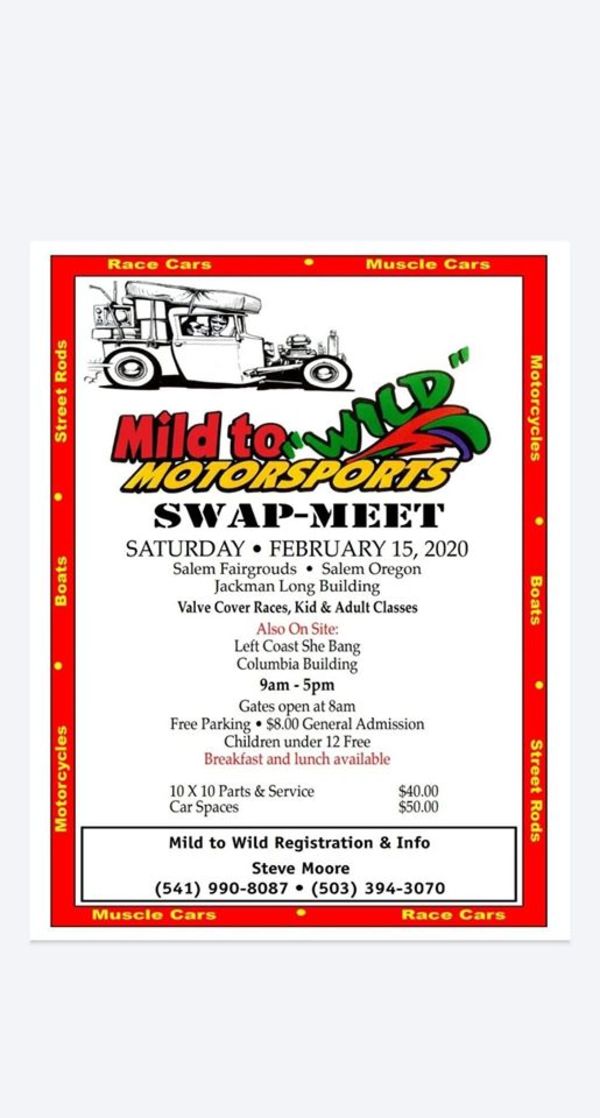 This years swapmeet will be at the Jackman Long building at the Salem Fairgrounds Feb.15th , along with the Swapmeet we will be having a competition vehicle show with trophies awarded by audience voting . In the Columbia Hall will be the Left Coast Shabang Show featuring cars, trucks bikes etc. There will a live band ,and tattooing by Hot Rod Betties Tattoo